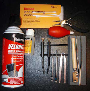 cutter, tweezers, air blower, lens tissues, cotton swabs and needle nose